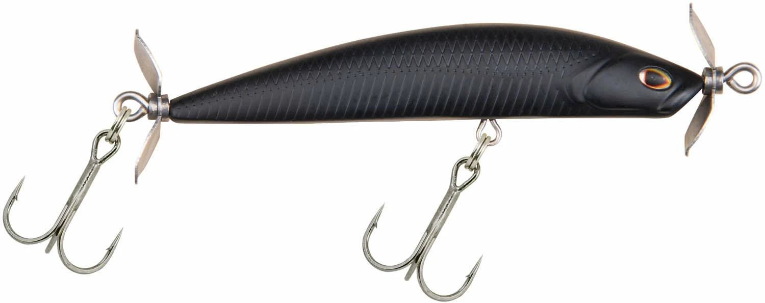 - Two easy-spinning propellers and a body shape that produces a tight-shimmying action that’s essential when the bite’s tough.